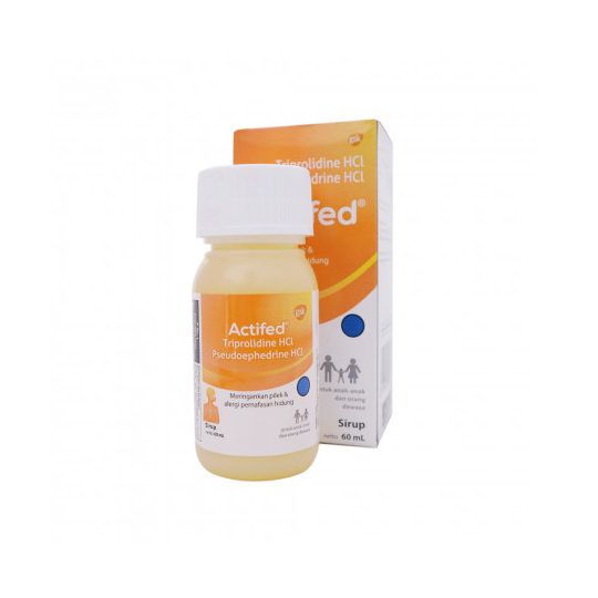 ACTIFED SIRUP KUNING 60 ml mengandung Pseudoefedrin HCl dan Triprolidine, digunakan untuk meringankan gejala pilek dan alergi.